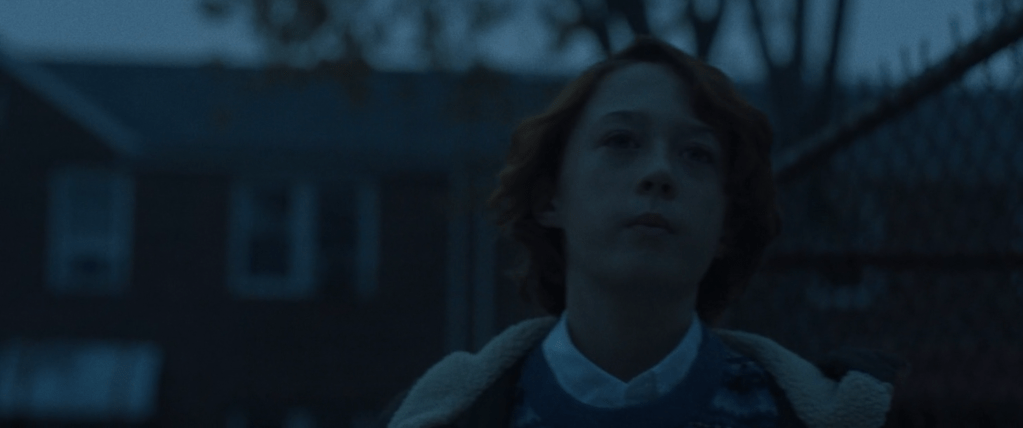Em cada cena na qual o garoto falha em conseguir reter uma consciência lúcida diante do que o momento lhe pede é feita a inscrição do zoom in ou de algum tipo de aproximação tateante; no entanto, no desfecho, o último olhar lançado aos lugares onde se passaram os episódios vividos é dado pela repetição sucessiva de zoom outs. A escolha dos lugares é em si mesma bastante significativa: o pátio da nova escola, lugar dominado pelos discursos dos Trump e pelo fatídico plano do roubo, do qual Paul se distancia diegeticamente; a sala de aula da velha escola, onde fomos apresentados à Johnny (Jaylin Webb); a sala de jantar de sua casa, cenário do convívio familiar que também é o lugar onde ele recebeu de seu avô Aaron (Anthony Hopkins) as aquarelas.