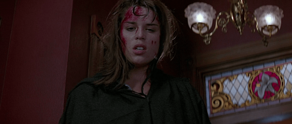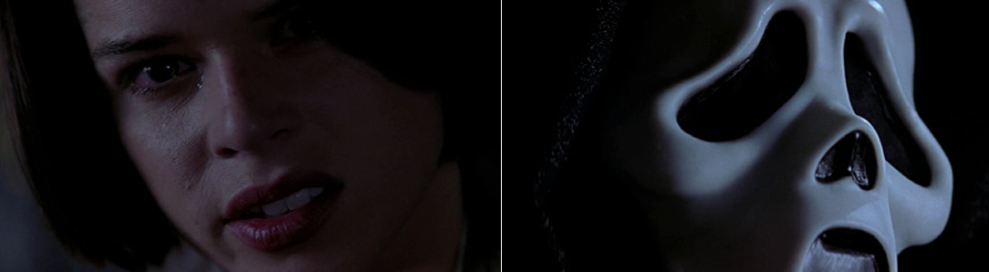 Encurralada, esfaqueada, ensanguentada, Sidney corre, rasteja, foge, luta. A performance de Campbell é corporal, primitiva, bruta. Quando reencena a sequência inicial de Drew Barrymore (cujo rosto, longe do anonimato, já era codificado pela indústria), a atriz não reproduz o repertório da primeira vítima: ela desafia o assassino, confronta-o verbal e fisicamente, digladia pela própria vida. A compleição do rosto da atriz, curiosamente, é perfeita. Somos capazes de reconhecer em seus olhos semicerrados o medo que a consome enquanto seu maxilar, levemente projetado, interpela corajosamente seus algozes. Na linhagem de Jamie Lee Curtis, Neve Campbell não é somente a vítima, mas também aquela que afronta os antagonistas da narrativa (no segundo filme, ela será comparada a Linda Hamilton). A inversão de papéis ocorrida no desfecho do filme, onde é ela quem se veste de ghostface e telefona para os assassinos, é a ilustração final dessa postura proativa.