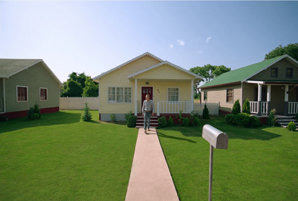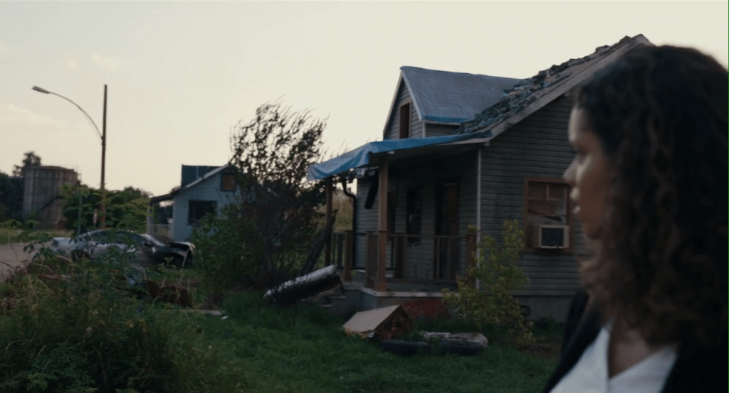 É apenas no dia seguinte que Tess percebe de fato onde está e por que Keith havia insistido para que ela não saísse de noite sozinha em seu carro à procura de um hotel: o bairro em que se encontra a casa do Airbnb, Brightmoor, é uma imagem exemplar da decadência de Detroit, casas abandonadas e pichadas, carros destruídos, gramados altos e cheios de lixo. A personagem sai para sua entrevista em um prédio novo e moderno no centro da cidade, região recém gentrificada, e retorna à casa. Chegando lá, um homem, que parece ser um morador de rua, vem correndo em sua direção, lhe chamando e pedindo para que saia dali. Assustada, Tess entra correndo no Airbnb. Há aqui uma inversão interessante: se na noite anterior era o interior da casa que parecia ser perigoso, seja por conta da presença do homem desconhecido lá dentro, seja simplesmente porque não conseguimos ver o que havia lá fora no escuro, agora é o exterior que apresenta alguma ameaça e a casa se torna um refúgio, um recanto limpo e reformado no meio dessa terra de ninguém.