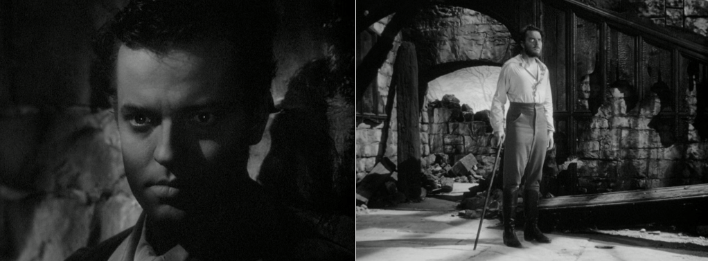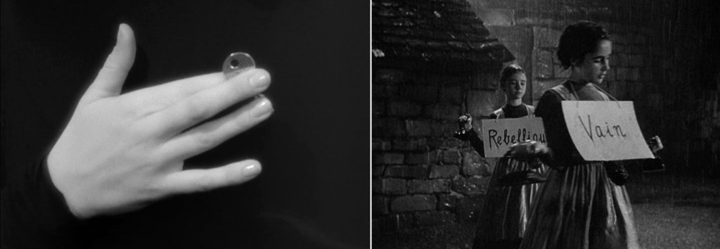 Além desses terrenos profundamente simbólicos e autônomos, há nesses filmes um verdadeiro apreço por certos rituais (o casamento, a noite de núpcias, a escolha do vestido), o que acaba lhes aproximando ainda mais de uma verve sadomasoquista. Não é à toa que, neles, as chaves ganham em potência figurativa, elas dominam o close-up: o fato de possuí-las ou não configura já uma intriga suficientemente complexa e, sobretudo, prazerosa na sua duração. Que Welles e Fontaine se beijem ou não em Jane Eyre (1943), pouco importa. É o tempo decorrido entre o primeiro encontro e o “embate final” entre esses dois amantes que vale mais que qualquer resolução imediata. Dirigido por Robert Stevenson, esse filme se compõe unicamente de contrastes que sublinham a distância entre esses dois corpos que em tudo se opõem: tal como um monstro expressionista, Welles habita as sombras e tem seu rosto chamuscado por sabe-se lá que matéria negra, enquanto Fontaine se expõe frontalmente à luz, de forma a se tornar, ela mesma, um holofote. Desse suspense erótico, o espectador anseia pelo momento em que a heroína suja as mãos com o sangue derramado pelo seu amante, ao passo que esse finalmente se desnuda aos olhos e na luz de sua companheira.