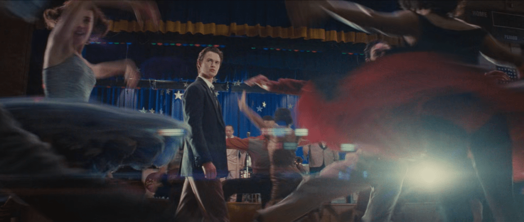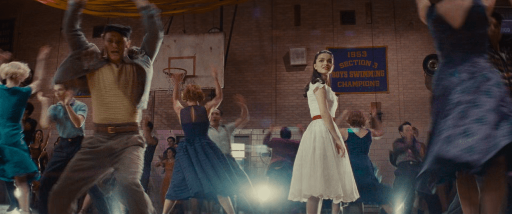 Essa artilharia técnica não encobre a emoção, ela reforça, adensa o embalo do espectador. Intercalando momentos de febre delirante com suspensões do tempo, o filme respira num ritmo próprio. A cena do baile na escola é um bom exemplo: dentro do gigantesco número de dança (a mesma coreografia, mais puxada para o jazz-rock de um lado e para o flamenco do outro), uma série de micro-eventos vão se revezando no proscênio. Um chute no ar e uma breve abertura no espaço é preenchida por Anybodys (Iris Menas), o garoto trans que tenta em vão encontrar seu par, sendo rechaçado pelos “colegas”. Um dançarino empurra outro e esse gesto dá lugar para o Oficial Krupke (Brian d’Arcy James) que cheira o ponche de uma garota latina. A câmera demora um segundo e é suficiente para capturar o olhar racista de uma moça branca. Uma mudança de cadência justifica um corte e vemos Chino (Josh Andrés Rivera) resistindo a entrar na dança e Maria (Rachel Zegler) largando a sua mão. É num movimento um pouco mais prolongado que vemos Tony (Ansel Elgort) chegar e ser recebido pelo olhar frio de Krupke. E eis que, de repente, Tony vê Maria, Maria vê Tony e todo o resto desaparece. Um silêncio delicado no olho do furacão. Imantados por esse olhar, os dois se conduzem para trás da arquibancada, e como aves raras, dão o espetáculo sussurrado da sua dança de acasalamento.
