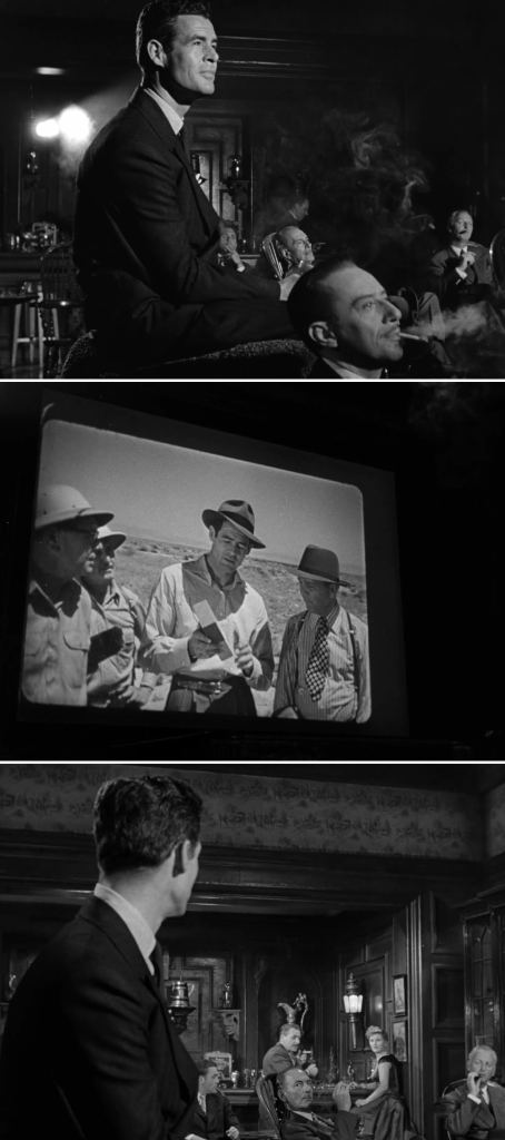 As sombras que cercam Leonora são o domínio de Smith Ohlrig (Robert Ryan), dono do iate e da festa, o milionário com quem ela ensaia um romance relutante, possível justamente pelas fissuras dentro das personas que ambos escolhem projetar: Leonora lhe parece “mais doce que as outras garotas”, seu resquício de candura contradiz a artificialidade de costume e Ohlrig, apesar de já prenunciar a persona controladora e cruel que veremos depois, ainda hesita, deixa escapar lapsos de impulsividade e vulnerabilidade ferida, ainda age como “um ser humano”. O impulso de desafiar a previsão de catástrofe de tal união, decretada por seu psicanalista, é o suficiente para que Ohlrig se decida pelo casamento.