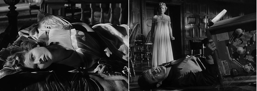 Se Leonora está realmente “apanhada” como nos avisa o título, é no impasse entre essas duas visões de mundo, entre os olhares desses dois homens. Uma recaída com o marido se torna um obstáculo para o novo romance diante de uma gravidez, o que dá margem para uma nova chantagem, de aprisionamento definitivo. Em nome da criança que vai nascer, Leonora volta ao Xanadu soturno de Long Island para sofrer novas torturas. Uma confrontação inevitavelmente acontece, mas o que importa não é o embate entre os dois homens por Leonora, feito em montagem dialética de campo e contracampo e confinando toda a agressividade às palavras e ao contraste entre a leveza de Mason e a energia crispada de Ryan, mas por qual moral deve prevalecer. Num plano notável que parece uma metonímia dramática do filme, a câmera acompanha Bel Geddes andando de um lado ao outro entre Mason e Ryan, tendo por divisória uma escada que enquadra seu corpo como uma grade de prisão. Leonora termina por ceder à chantagem, mas o seu desejo pela libertação é poderoso e se concretiza num espetacular ataque neurótico em que ela efetivamente rompe com o controle do marido, negando a ele não apenas o socorro, mas sua própria pessoa. Não deixa de haver certa justiça poética no fato de que seu maior ato de rebelião esteja justamente em se deter, imóvel, diante do corpo prostrado de seu algoz (melhor ir contra sua própria natureza dócil que impor a si mesma a violência da tirania; melhor que a criança viva livre na carestia do que aprisionada). A ruptura, no entanto, é ambivalente: Ohlrig sobrevive, ainda que banido para o extracampo, e Leonora perde o bebê que era o motivo do seu sacrifício. A notícia da libertação agridoce é dada numa ambulância: Bel Geddes paralisada, quase imóvel, Mason e o quadro vão se fechando sobre ela, sua voz sentencia “você está livre” mas também “você deve querer viver”. De fato, a chantagem do primeiro marido se resolve, resta o próximo. Ophüls conclui o filme com um irônico movimento acompanhando uma enfermeira que se livra do casaco de mink, a identidade anterior de Leonora definitivamente descartada. Vemos Leonora pela última vez brevemente e de longe, aos cuidados vigilantes do bom médico. Seu colega nos fecha a porta.