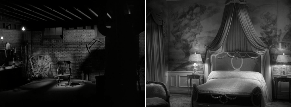 A decoração da casa é barroca: máscaras, quadros e papéis de parede pomposos, inúmeras cortinas e, é claro, inúmeras portas. Não simplesmente esta casa é dele e de sua família mas, sendo um arquiteto, ele a projetou, e projetou também suas armadilhas. De acordo com sua própria teoria, afinal, a arquitetura de um quarto define o que acontecerá nele. Esta teoria poderia se aplicar a qualquer filme de “casas mal-assombradas”, que não por acaso costumam ter uma arquitetura gótica e sombria a priori, antes mesmo de qualquer coisa acontecer ali. A diferença é que, geralmente, em tais histórias de terror, ainda que já tenha tal arquitetura, esta é incidental, a casa se torna mal-assombrada porque algo aconteceu ali, e não o contrário.